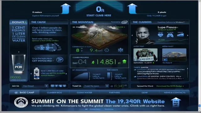 The 16,709,760-pixel Web site allowed fans to climb with the team in real-time. You could follow their photos, videos and tweets along the way, as well as track their vitals, their position on the mountain and the current weather conditions. Most importantly, you could donate water by sponsoring a foot of their climb.